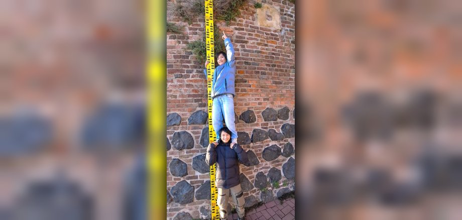 In Hinblick auf den Preis, stellten sich Léon und Tim Scholten am Reeser Zollturm die Frage, wie sich das Jahrhunderthochwasser von 1926 anschaulich vermitteln lässt. Die Antwort war so einfach wie eindrücklich: Zwei übereinander gestapelte Kinder, die den historischen Wasserstand „erreichen“.