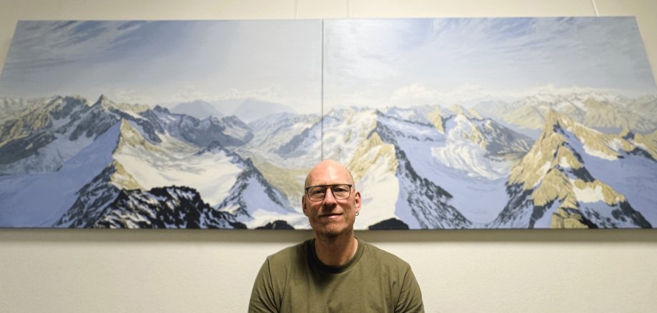 Es ist eine Reise in vertraute Strukturen, Sehnsüchte, eigenen Erinnerungen und auch in die Mathematik. Benjamin Vogel verbindet Kunst mit Tangente und Kurven, mit Geometrie und Pinsel. „Ich bin in beiden Welten zuhause und mit beiden vertraut“, sagt der Künstler. An der TU Dortmund hat der hauptberufliche Lehrer nach Bauingenieurswesen auch Mathematik und Kunst studiert. Nebenbei liebt er die Berge. Aus diesen Komplexitäten entstehen seine Werke – auch in Hinblick der Veränderungen. „Ich beschäftige mich seit über 25 Jahren mit diesen Landschaftsstrukturen. Die Berge verändern sich. Das Panorama wird geschäftiger und kahler“, bedauert Benjamin Vogel.