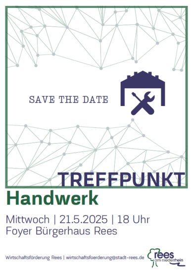 Mit dem „TREFFPUNKTHandwerk“ bietet die Stadt Rees eine Plattform für Vernetzung, Innovation und Inspiration. Die Teilnahme an der Veranstaltung ist kostenlos, eine vorherige Anmeldung ist erbeten: wirtschaftsfoerderung@stadt-rees.de.