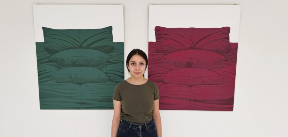 Elisa Kullmann macht das Vertraute fremd und eröffnet damit neue Perspektiven auf das Alltägliche. In ihrer künstlerischen Arbeit stehen Kleidung, Muster und Gebrauchsgegenstände nicht für sich selbst, sondern werden fragmentiert, verfremdet und neu zusammengesetzt. Durch diesen Prozess der Wiederholung und Variation entstehen poetische Bildräume, die für sich sprechen sollen. „Die Werke funktionieren ohne Worte. Sonst bräuchte ich die Bilder nicht“, so Kullmann. Die Ausstellung macht Kullmanns charakteristische Arbeitsweise erfahrbar: ein ständiges Wechselspiel zwischen Bildfläche und Betrachtenden, ein offener Raum für Assoziationen und Geschichten, der Fragen stellt, statt Antworten zu geben. Die digitale Welt transformiert Elisa Kullmann ins Analoge mit Themen unserer Zeit: Künstliche Intelligenz, Konsum, gesellschaftliche Wahrnehmung und das Laminiergerät.