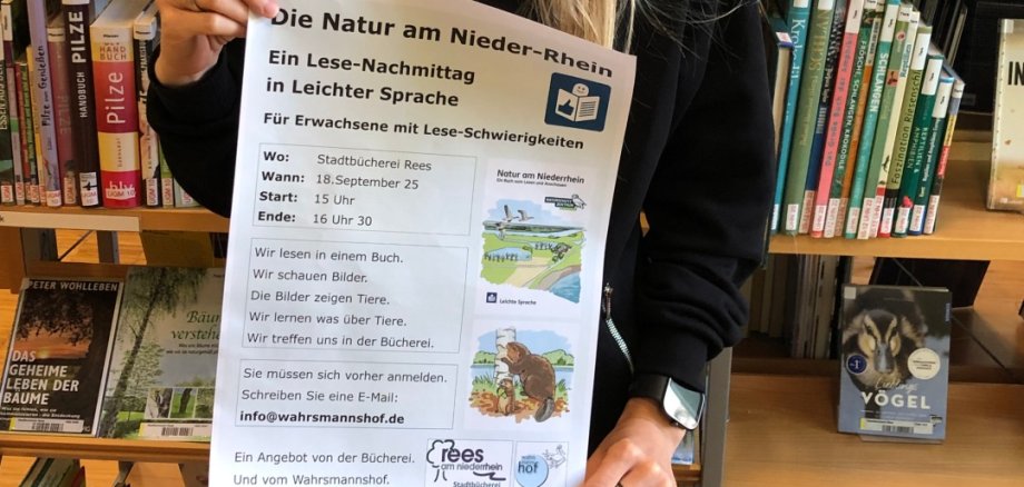 "Das Heft steht unter dem Motto „Alle in die Natur“, damit jeder Mensch etwas über die Natur lernen kann", erklärt Büchereimitarbeiterin Elisabeth Habers, die die Veranstaltung mit organisiert hat. So kommen in dem Buch bekannte Tiere wie Steinkäuze und Biber, aber auch Kröten und Libellen vor, dazu erfährt man Wissenswertes über Wasserpflanzen wie Röhricht oder Seerosen. Ein besonderes Augenmerk legt das Heft auf die Erklärung der Bedeutung von Naturschutzgebieten und der Arbeit von Biologischen Stationen. Das Heft ist in leichter Sprache geschrieben, damit alle Menschen es gut lesen können. „Leichte Sprache ist gegenüber der normalen Schriftsprache sprachlich und inhaltlich vereinfacht", erklärt Büchermitarbeiterin Habers. Bei leichter Sprache zielt die Ausdrucksweise auf die besonders leichte Verständlichkeit. Wissen kann so für Menschen insbesondere mit kognitiven oder sprachlichen Beeinträchtigungen besser vermittelt werden. Deshalb wurde das Projekt „Natur am Niederrhein“ vom Landschaftsverband Rheinland finanziell gefördert. Das Heft ist kostenlos in der Stadtbücherei Rees und beim Naturschutzzentrum im Kreis Kleve erhältlich.