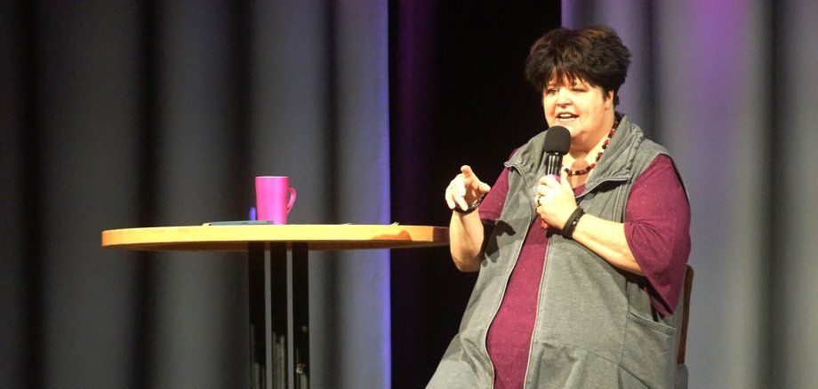 Zum Auftakt des höchst amüsanten Comedyabends hielt Ingrid Kühne Rückschau auf die „drei Säulen“, die ihr Humorverständnis bereits in der frühen Kindheit geprägt haben: Mutter Gertrud, die den Karneval und die Theaterlandschaft in Aldekerk mit ihren Auftritten befeuerte und die Tochter stets darin bestärkte, ihren aus Otto-Platten erworbenen Humor mit dem Publikum zu teilen. Vater Alfred, dessen trockenen Humor man nicht lernen kann, weil der angeboren sein muss. Und schließlich die „Pittjes“-Erdnüsse, die in Kneipen auslagen, lecker schmeckten und auf deren Rückseite, nun ja, Witze gedruckt waren. „Es waren wirklich schlechte Witze“, blickte Ingrid Kühne zurück und gab ein paar Kostproben: „Wie heißt ein Hund, der zaubern kann? – Labrakadabra“.