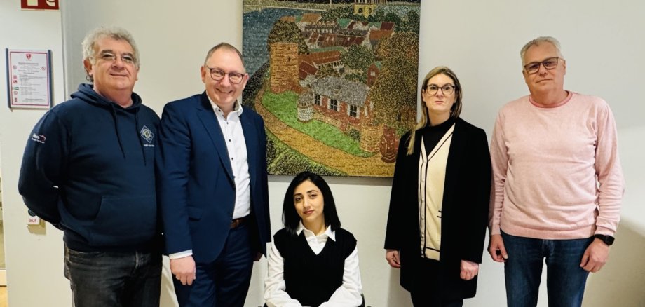 Die Künstlerin Lusine Armenyan aus der ZUE Rees war seinerzeit vor Ort und überreichte genau dieses Bild im Pointilismus-Stil jetzt der Stadt. „Es ist ein besonderes Geschenk, das wir gerne hier im Rathaus der Öffentlichkeit dauerhaft präsentieren“, so Hense.