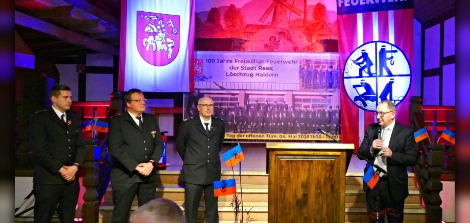 Über 120 Feuerwehrleute aus allen fünf Reeser Löschzügen waren nach Haldern gekommen, um dort das 100-jährige Jubiläum der Halderner Feuerwehr zu feiern. Halderns Löschzugführer Matthias Storm ließ in seinem Rückblick 100 Jahre Feuerwehrgeschichte Revue passieren: Am 8. Dezember 1925 wurde die Freiwillige Feuerwehr Haldern gegründet. Die Ausrüstung war zu dieser Zeit denkbar einfach. Die Pumpe wurde noch per Hand bedient. „Doch die Feuerwehrleute waren kreativ und engagiert. Sie halfen bei Bränden nach Kräften“, berichtete Matthias Storm.