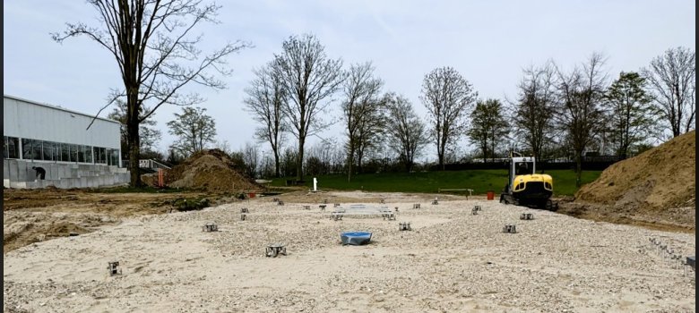 Im Außenbereich konnte bereits das Schwallwasserbecken im Unterboden fertiggestellt, sowie der Bereich mit den Winkelstützen für die Spielgeräte des Wassersprayparks vorbereitet werden. In Kürze folgt der rutsch- und witterungsfeste Gummiboden. Die ersten Spielgeräte werden im Mai installiert. Ein barrierefreier Zugang zum Stadtbad über eine Rampe für Menschen mit Mobilitätsbeeinträchtigungen aber auch für Eltern mit Kinderwagen wird gerade aufgebaut.
