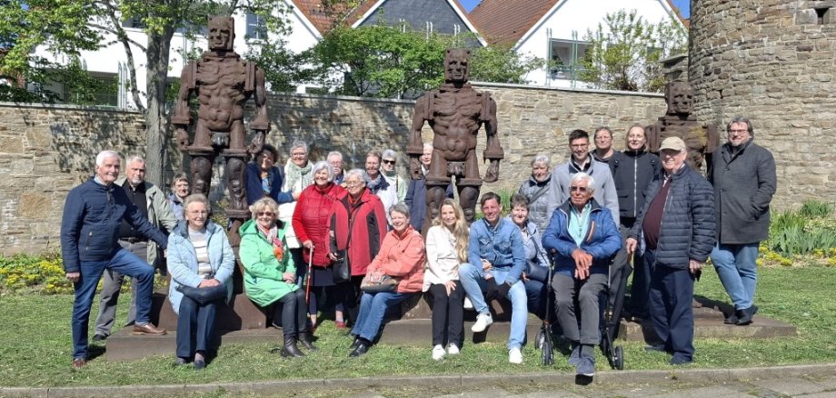 Ein besonderer Blickfang sind auch die „Menschen aus Eisen“ des polnischen Bildhauers Zbignjew Fraczkiewicz. Seit 1996, als sie zum 600-jährigen Stadtjubiläum aufgestellt wurden, sind die 2,40 Meter großen Eisenmänner bei Bürgern und Besuchern durchaus umstritten. Die Reeser Gäste gingen jedoch auf Tuchfühlung und nutzten die Skulpturen für ein Gruppenbild.