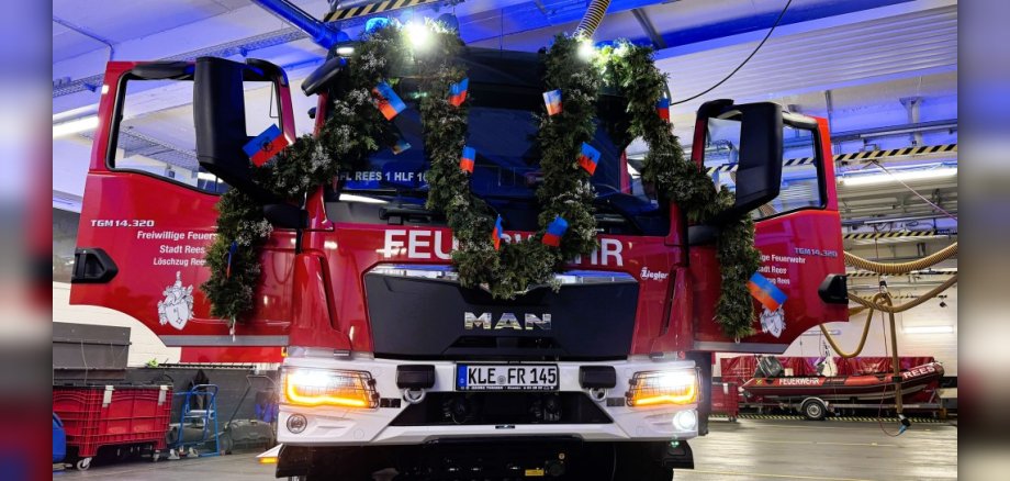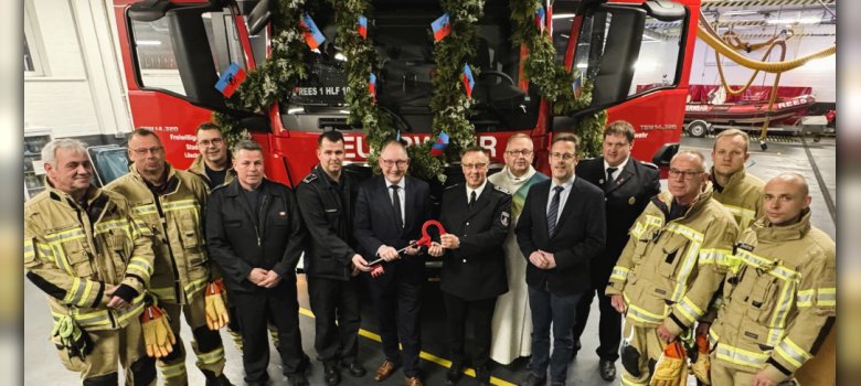 REES. Die Stadt Rees modernisiert die Einsatzfähigkeit ihrer Feuerwehr. Der Reeser Bürgermeister Sebastian Hense hat jetzt gemeinsam mit der Wehrleitung Marc Pohle, Jörg Vogel und Benjamin Boerboom sowie Frank Postulart, Fachbereichsleiter Öffentliche Ordnung und zuständig für Feuerwehrangelegenheiten, das neue Hilfeleistungslöschgruppenfahrzeug 10 (HLF 10) offiziell in Dienst gestellt. „Mit der Anschaffung investiert die Stadt gezielt in moderne Technik und erhöht damit die Sicherheit der Bürgerinnen und Bürger sowie der Kameradinnen und Kameraden“, sagte Hense in seiner Ansprache vor den rund 40 Feuerwehrleuten im Gerätehaus des Löschzugs Rees-Stadt. Maik van Bebber, Löschzugführer der Einheit, führte durch den Abend. Die Segnung nahm Diakon Michael Höfer, selbst Feuerwehrmann, vor.