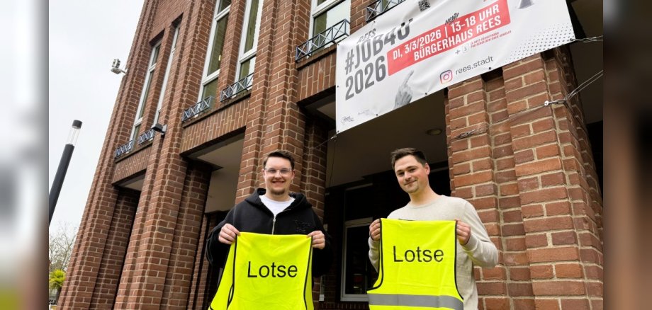 REES. Bei der kommenden Ausbildungs- und Jobbörse „Job4U“ (Dienstag, 3. März 2026, 13-18 Uhr) gibt es einen besonderen Vermittlungsservice. Die Auszubildenden der Reeser Stadtverwaltung Luca Hütten, Verwaltungsfachangestellter, und Julian Maaßen, Duales Studium kommunaler Verwaltungsdienst, stehen als sogenannten „Lotsen“ am Eingang des Bürgerhauses bereit, um Besucherinnen und Besucher gezielt zu den passenden Ausstellern zu lotsen. Ob nach Branche, Ausbildungsberuf, Einsatzort oder individuellen Interessen – die Job-Lotsen helfen dabei, schnell die richtigen Ansprechpartner zu finden und den Messebesuch effektiv zu gestalten. „Bei der Vielzahl an Angeboten und Ausstellern möchten wir unsere Gäste unterstützen, schnell den Weg zu ihren Interessen zu finden“, erklärt Sandra Kimm-Hamacher von der Reeser Wirtschaftsförderung, die die Job4U gemeinsam mit dem Wirtschaftsforum Rees organisiert. „Wer aber einfach erstmal stöbern möchte, kann das natürlich auch tun. Die Lotsen stehen während der gesamten Veranstaltung bereit.“ Dieses Modell erfüllt aber noch einen weiteren Zweck, wie Mitorganisatorin Annette Kook erklärt: „Da sich beide Lotsen ebenfalls in der Ausbildung befinden, können sie eine gute Vermittlungs- und Gesprächsbasis schaffen. Das senkt die Hemmschwelle für den Erstkontakt.“