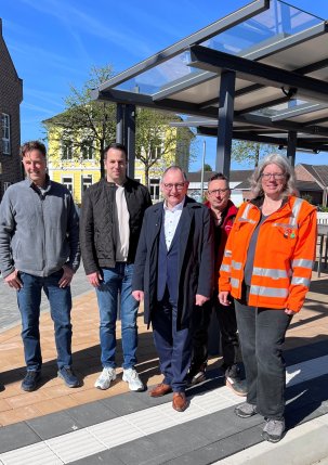 Der neue Busbahnhof in Rees nimmt ab Montag, 13. April seinen Betrieb auf. Darauf freuen sich von links: Torsten Feldkamp, Geschäftsführer KI Kottowski Ingenieurgesellschaft mbH, Johannes Fehlemann, Geschäftsführer Völkers Bau GmbH, Bürgermeister Sebastian Hense, Christof Schmitz, Bauleiter Völkers Bau GmbH und Bettina Beuchelt-Giesen (Stadt Rees) |