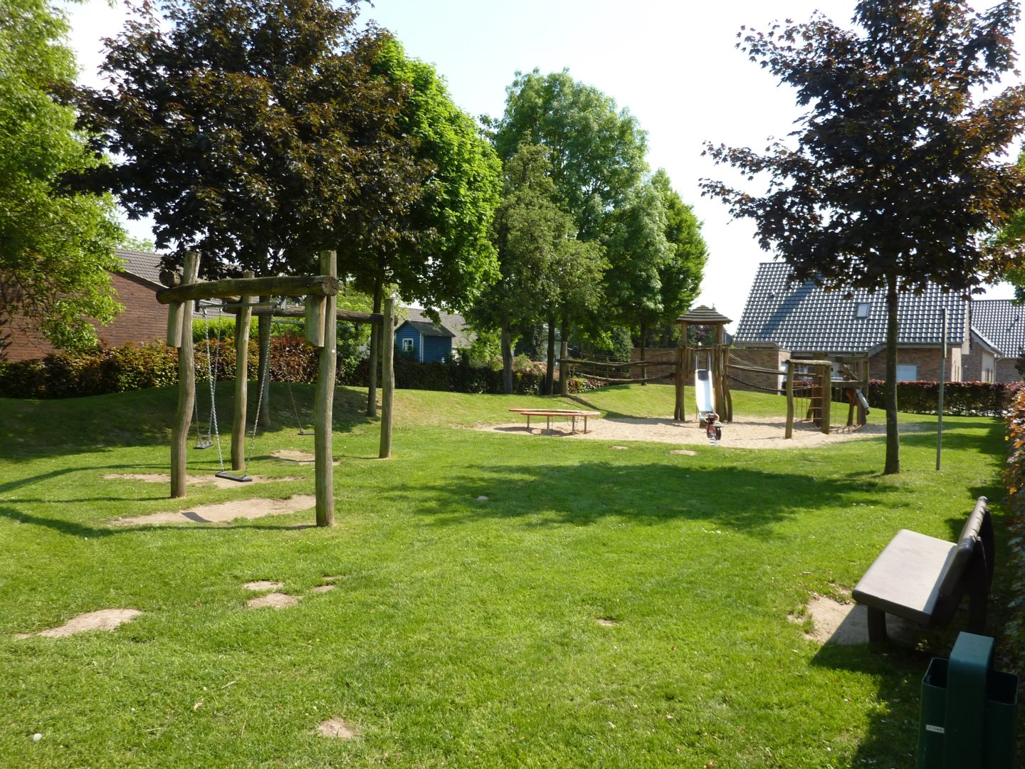 Große Grün- und Sandbereiche sind auf dem Spielplatz Reeser Feld vorzufinden. Das Klettergerüst mit Rutsche und Seilkletterwand rundet den Spielplatz neben drei Schaukeln, einem Matschtisch und einem "Schaukelpferd" ab.