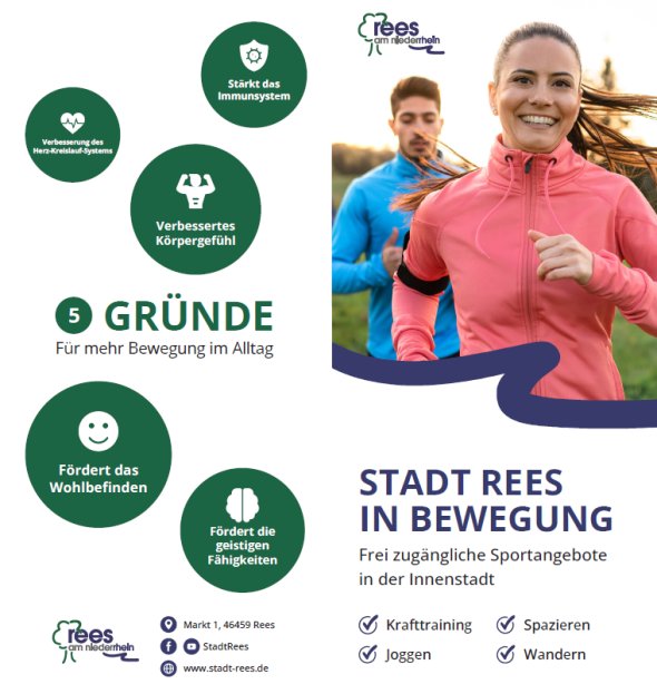 In der Innenstadt von Rees wurde im September 2022 eine Calisthenics-Sportanlage sowie eine 6km Lauf-, Wander- und Spazierstrecke eröffnet. Die öffentliche und kostenlos nutzbare Anlage lädt Sportler, Einheimische und Gäste der Stadt dazu ein, individuell zu trainieren, Kräftigungsübungen zu machen, Kondition zu tanken oder mit einfachen Übungen das persönliche Wohlbefinden zu stärken.