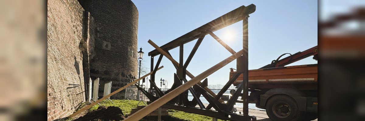 The element of a Bailey Bridge exhibited here was recovered in August 2022 by Thijs van Dooren and helpers on the right bank of the Rhine near Rees. It was restored and painted in the Netherlands. A special feature of this Bailey frame are the four barbed elements that had clawed their way into the banks of the Rhine since 1945. As an anchor, the exhibited part, secured the actual Bailey Bridge.