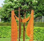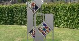 Zweigruppe; konstruktivistisches Aluminiumobjekt mit diagonal versetzten quadratischen Fenstern und farbiger Buntglasfüllung. Die Stelen haben ein variables Wechselspiel von offenen und geschlossenen Oberflächen, die mit Metalllack beschichtet sind.