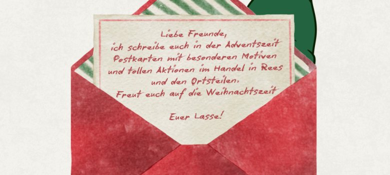 Der Wichtel Lasse hat bereits im vergangen Jahr die Reeser Händlerinnen und Händler besucht, verzückt und seine Späße getrieben. In diesem Jahr kommt er in der Weihnachtszeit sowie zum "Et Rääße Weihnachtspädje" wieder und hat was im Gepäck: Lasse hat die Zeit genutzt und besondere Postkarten liebevoll kreiert und gedruckt. Die gibt es jetzt im teilnehmenden Handel in Rees und den Ortsteilen kostenlos zum Mitnehmen und verschicken oder sammeln. Bei allen teilnehmenden Händlerinnen und Händler gibt es zudem besondere Weihnachtsaktionen.