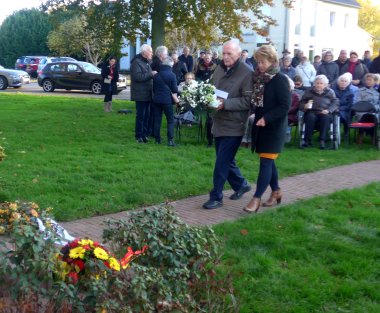 Der ehemalige Zwangsarbeiter Ap Gerritse legt mit Wilma Assink, Stichting Dwangsarbeiders Apeldoorn 1940-1945, Blumen nieder.