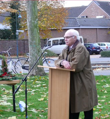 Der ehemalige Zwangsarbeiter Ap Gerritse legt mit Wilma Assink, Stichting Dwangsarbeiders Apeldoorn 1940-1945, Blumen nieder.