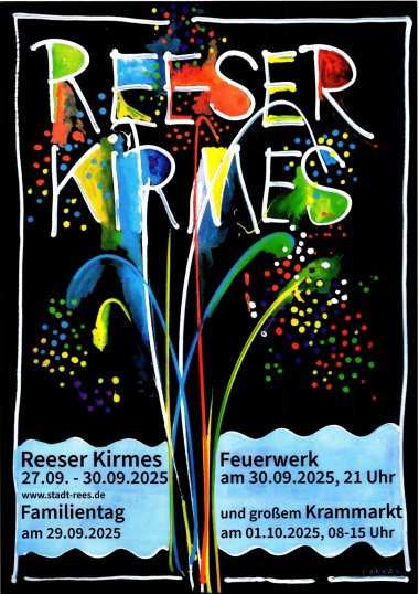 Die Reeser Kirmes findet in diesem Jahr vom 27.09. bis 30.09.2025 im historischen Stadtkern von Rees statt. Am Mittwoch, 01.10.2025 schließt sich der traditionelle Krammarkt an, auf bis zu 90 Händler Waren von A-Z anbieten.