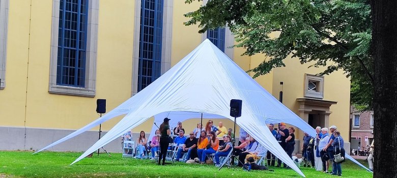 Eine AUSZEIT-Zone mit Themen-Pavillons zu Gesundheits-, Beauty-und Wellnessangeboten (mit Wohlfühlangeboten, z.B. Stuhl-Massage, Aromatherapie, Klangschalen-Sound-Bar und Ernährungsberatung) bietet im Schatten der Linden vor der Kirche Entspannung pur.